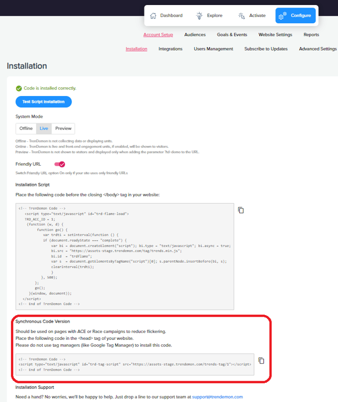 The first step in creating an ACE campaign is to install Trendemon's Synchronous code on the page you plan to run the campaign. You can find the synchronous code by navigating to Configure --> Account Setup --> Installation. Please make sure you install the code according to the specified instructions.