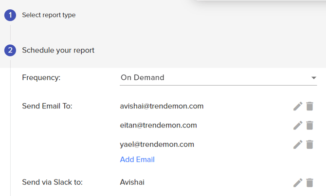 - Select the report frequency - this report also has an “on-demand” scheduling option which means you’ll receive it as a real-time email notification whenever a target visitor is on your website. Specify the recipient emails for the report.