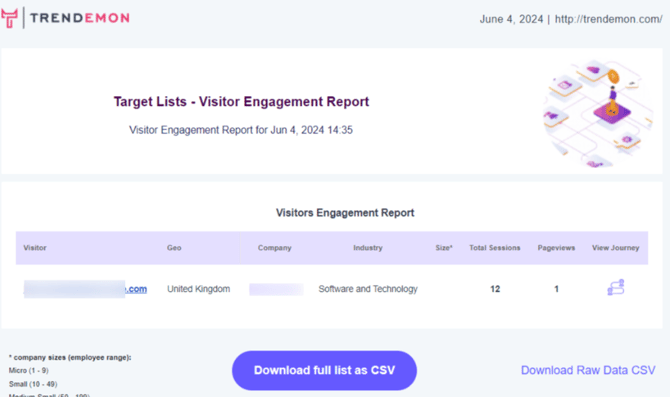 - The email you’ll receive displays visitor info like email, geo-location, and firmographic data, in addition to full website journeys and engagement metrics. You can also download a CSV copy of the data.