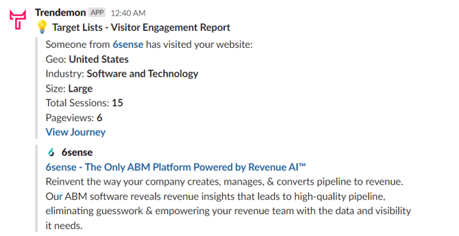 - The Slack alert displays summary info, plus a link to view the full visitor journey: