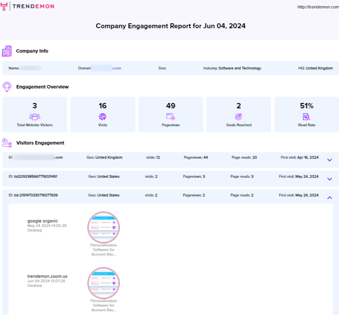 - Clicking on the link on the View Journey icon will open a visualization of the entire company journey. Here you can review aggregated engagement metrics for the company, alongside full journeys of each visitor: